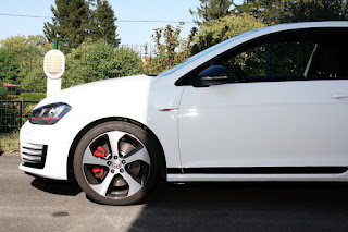 Ayant encore un peu de film 3M en stock, j'ai voulu voir ce que donnerait ma Golf avec des bandes latérales noires... Le travail n'est pas fameux, mais ça lui va plutôt bien !